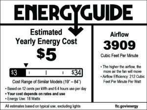 The data above represents high speed performance (excluding energy use for lighting components) based on the most current U.S. DOE mandated test method for ceiling fans.